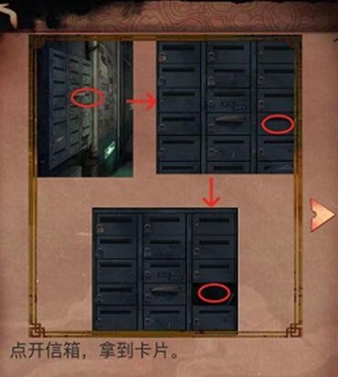 1、找右边保安室的保安,获取线索钥匙在邮箱里,在去左边信箱最右边没上锁的柜子拿到透明塑料卡片。