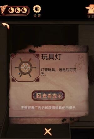 7、将【玩具灯】放到右侧墙壁上,点击之后可以得知六个方位的灯管亮起的顺序,几下这个顺序后回到院子,点击大门,按照顺序一次调整开关,大门打开后点击进入。