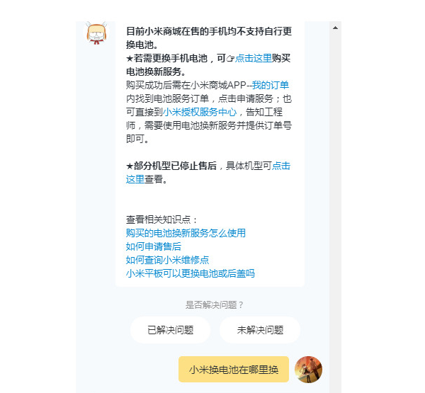 也可直接到小米授权服务中心,告知工程师需要使用电池换新服务并提供订单号即可。