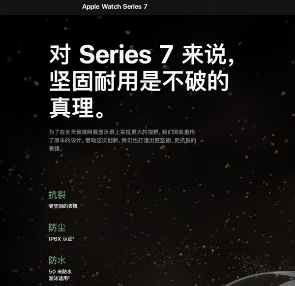 可用于游泳池或海滨游泳等较浅水域的水上活动,但并不适用于水肺潜水、滑水、面对高速水流的各种涉水活动及深水活动。此外,Apple Watch Series 7 的防尘性能达到 IP6X 级别。Apple Watch7得益于更大的显示屏,你可以迅速一览各项进度和指标,上山下海都没问题。