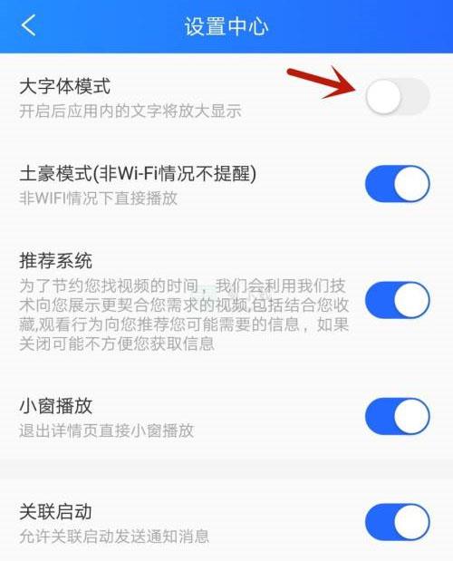 4、找到右侧的大字体模式,点击开启即可。