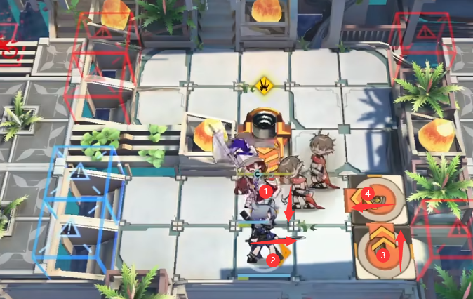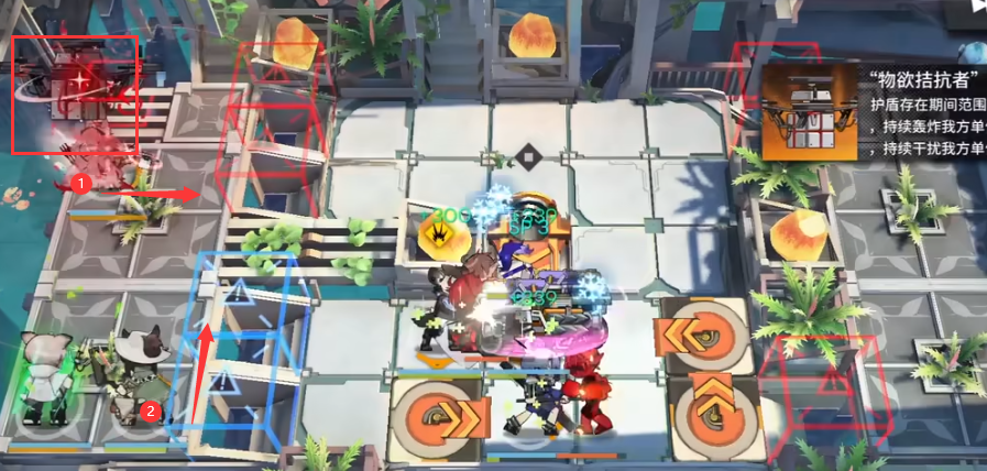 3.左边继续部署鸿雪(向右)和流星(向上),BOSS进入射程开启鸿雪技能。