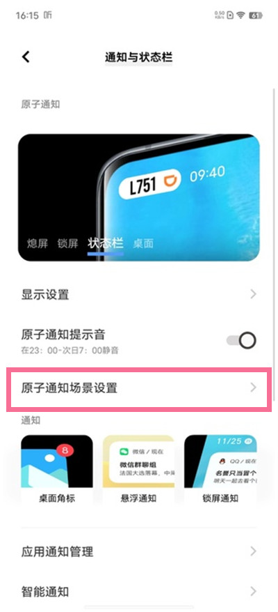 3、上滑页面找到【原子通知】,关闭后面的开关。