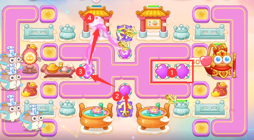 3、开道具顺序如图所示,我们开完的空位就放置魔法球升满级。