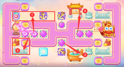 6、放置炮塔如图所示,魔法球全部放在中间位置,两边可以放置船锚补伤害。