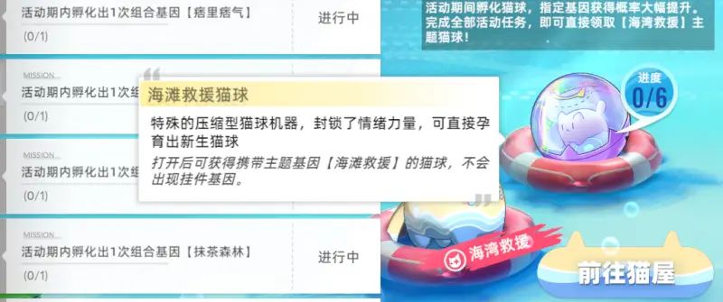活动期间只需要合成海湾救援的6个组合基因(蓝词条)即可领取【海湾救援】主题猫球,使用海湾救援主题猫球可以直接获得海湾救援主题猫。