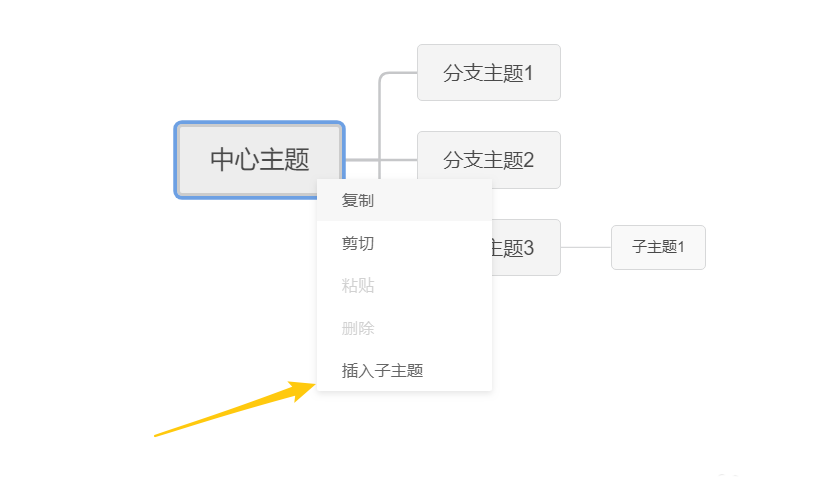 在出现的界面中,使用鼠标点击【中心主题】,点击【插入子主题】。