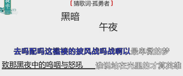 1、首先进入游戏可以看到一句长长的歌词【去吗配吗这褴褛的披风战吗战啊以最卑微的梦】,玩家需要根据给出的词来解答。