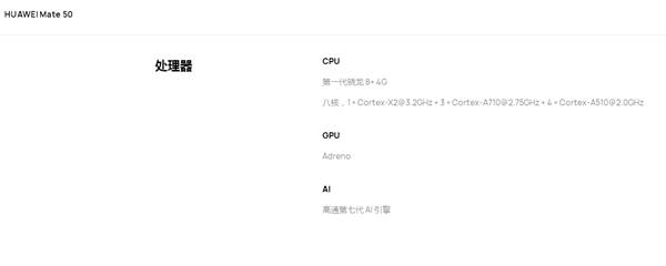华为mate50手机搭载骁龙8+ 4G芯片,由1 × Cortex-X2@3.2GHz + 3 × Cortex-A710@2.75GHz + 4 × Cortex-A510@2.0GHz组成,不支持5g。