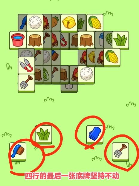 大家可以看到今天布局下面有四行牌,你只能看它首张的样子,完全不能推测下一-张所以小技巧第一条先消下面这四行的牌,一直消到只剩最后一张!