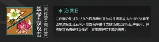 二件套分别提供15%的风元素伤害加成并提高攻击力18%这套圣遗物适合出现在利用鹿野院平藏作为站场输出的队伍中使用,井搭配其他增伤辅助角色,提高鹿野院平藏的伤害。