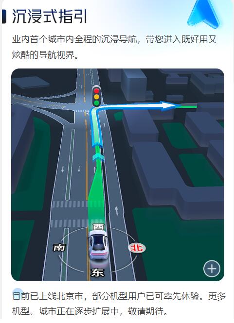 1、首先带来业界首个城市内全程的沉浸导航,拥有更加清晰的路口指引、更具科技感的视觉效果,目前已在北京市上线。