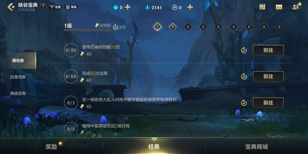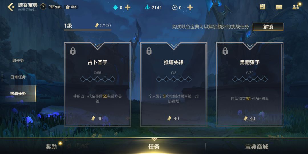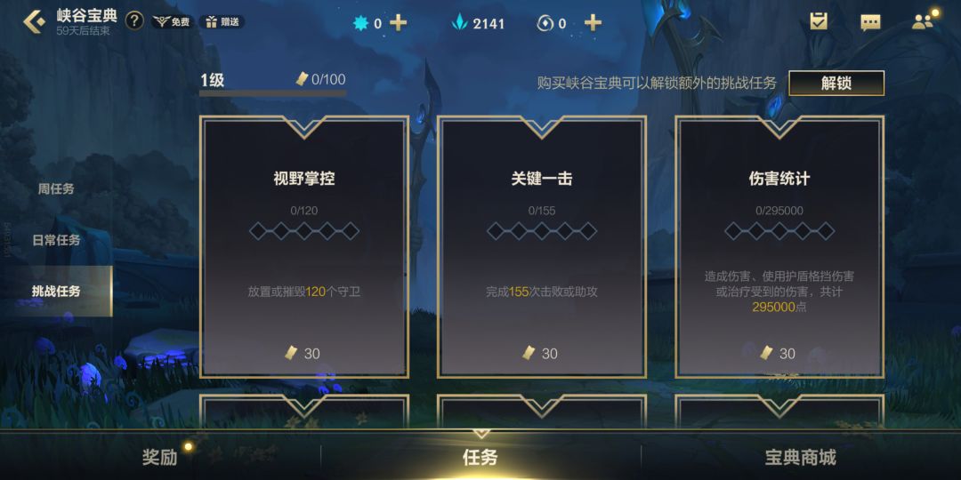 除了上述的每周任务外,召唤师们还能免费解锁部分挑战任务!从该版本起,会有50%的挑战任务免费解锁给所有召唤师,免费解锁的这部分挑战任务之前可是需购买高级版的峡谷宝典才可解锁的噢~