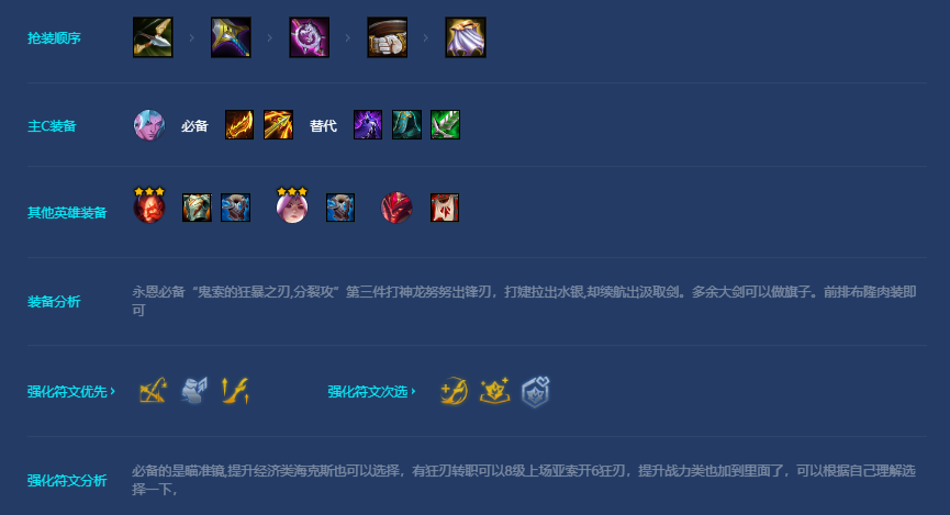永恩必备鬼索的狂暴之刃,分裂攻第三件打神龙努努出锋刃,打婕拉出水银,却续航出汲取剑。多余大剑可以做旗子。前排布隆肉装即可
