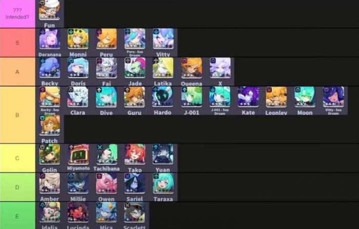 1、T0:利昂列夫(回血战士)、蝴蝶(金牌奶妈)、蛋蛋(前排坦克)、克拉拉(爆发刺客)、格里姆斯(单体输出射手)