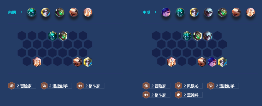 过渡推荐2射手/2炮手/3玉龙,2格斗,2护卫混搭 瑟庄妮可以跟图奇补2冒险,努努可以跟瑟庄妮补2重骑,李青跟伊泽瑞尔可以补2风暴