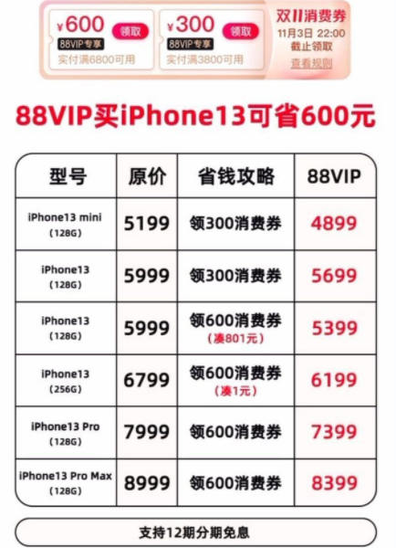 双十一iPhone 14 Pro预计可以降价300-600元,这里有一份去年双十一iPhone 13系列天猫活动价格表。88VIP会员通过消费券可满6800减600、满3800减300元购买iPhone 13可减600元优惠。