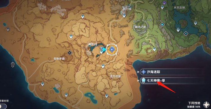 2、然后打开地图传送到下图所示位置,点击【七天神像-草】传送过去。