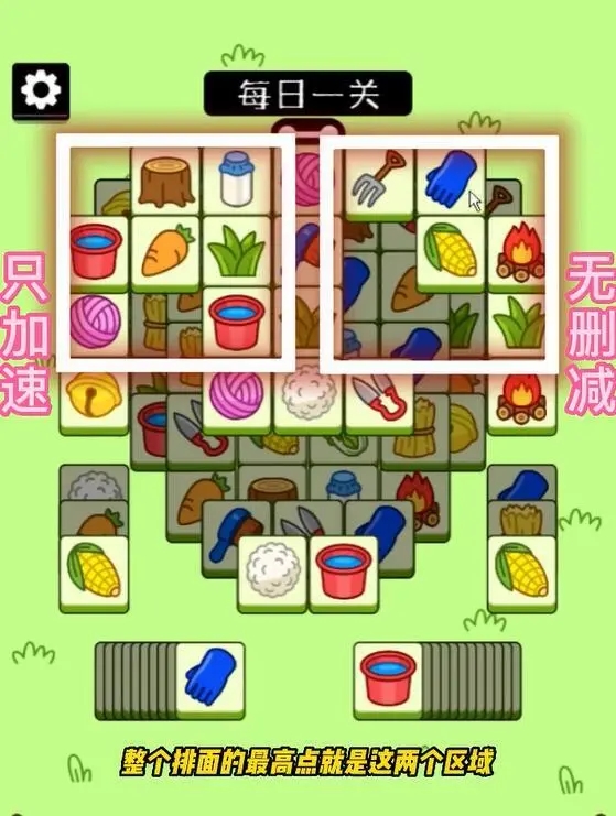 3、所以我们要优先消除这两个最高点,搭配下面的盲盒区的牌,一起消除。