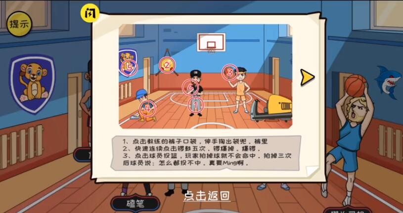4、点击教练手中的笔,移动到空中摔坏后,找到科比(磕笔)。