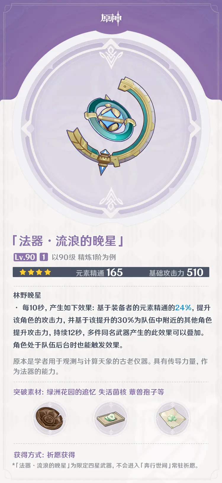 原神手游马上就要开启最新的神铸赋形祈愿,这次活动将会有全新的武器装备,而流浪的晚星作为其中之一,它的满级属性怎么样呢?关于这个小编已经帮大家准备好了相关内容,希望可以帮助到大家,快来和小编一起来看看吧。
