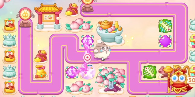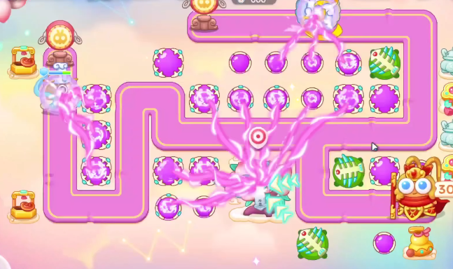 2、开局放置满级鱼刺先开图,左侧放置魔法球清怪,开完第一个道具继续放置魔法球开图。