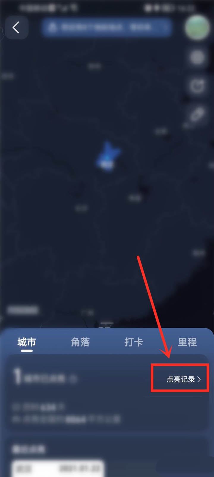 进入城市足迹界面,点击点亮记录选项。