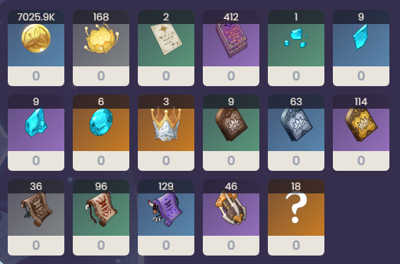「巧思」的哲学*16、禁咒绘卷*12、???*2、智识之冕*1、摩拉*700000