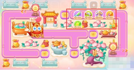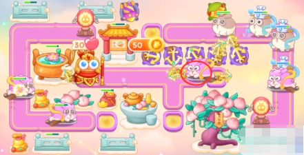2、开始的时候在右上角放置一个回旋镖,锁定下面的钱袋,有怪的时候打怪,中上放置一个烟花补漏,钱袋打掉之后,放置船锚,船锚要锁定老六兔。