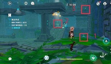 2、来到第二个房间,仍然首先点击控风按钮,关闭所有风场。依次将图中将1处风向向左、将2处风向向上并开启、乘坐2处风场来到3处将风向向左、回头将2处风向向左。原路返回,点击控风按钮,开启所有风场,按照如图箭头顺序,收集并完成挑战。