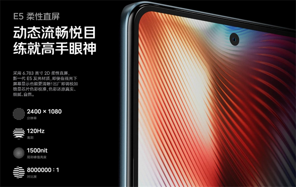 iqooneo7是三星E5材质的6.78英寸AMOLED柔性直屏,采用挖孔设计,支持120Hz刷新率、HDR10+、800W:1的高对比度,还支持360Hz的触控采样率和2000Hz的瞬时触控采样率。