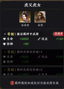 孙尚香和孙坚激活时,获得生命6000,攻击力160,防御80的属性加成,随着等级突破而上升!
