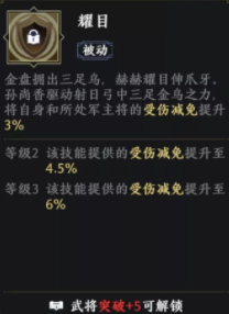 金盘拥出三足鸟,赫赫耀目伸爪牙。孙尚香驱动射日弓中三足金乌之力,将自身和所处军主将的受伤减免提升一等、