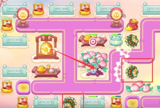 3.有钱将二级多重箭升级到满级,下方位置放一个满级多重箭,锁定桃树;