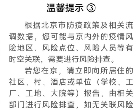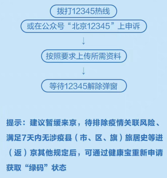 提示:建议暂缓来京,待排除疫情关联风险、满足7天内无涉疫县(市、区、旗)旅居史等进(返)京其他规定后,可通过健康宝重新申请获取“绿码”状态
