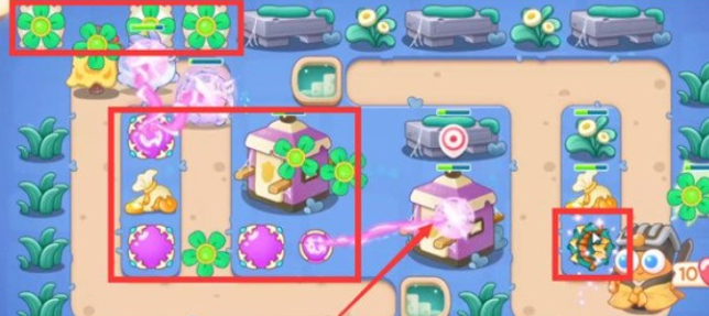 2.打掉后,在左上方的位置放一个风扇塔,多重箭拆除附近的道具,拆除顺序如下图: