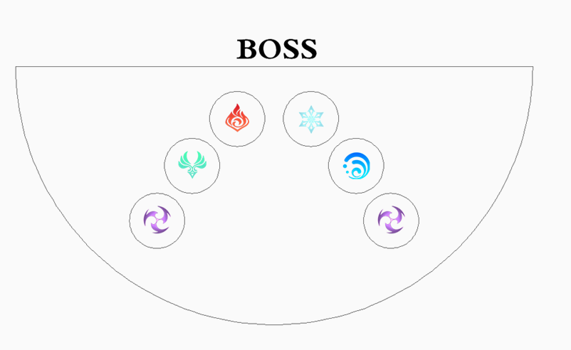 场地为半圆形区域。场地中有6个元素矩阵,除了雷元素矩阵外,其余矩阵没有触发次数限制,雷元素为2个元素矩阵,每个雷元素矩阵只能触发一次。
