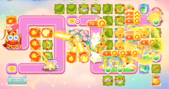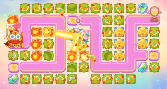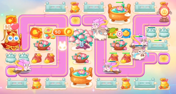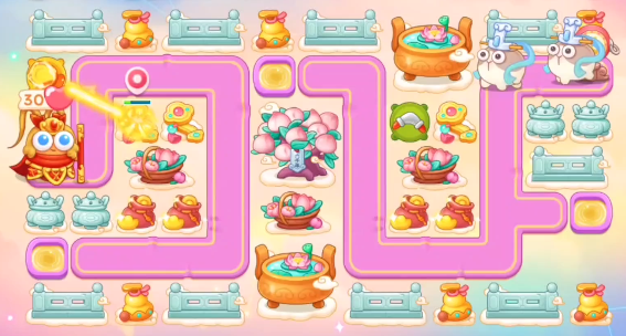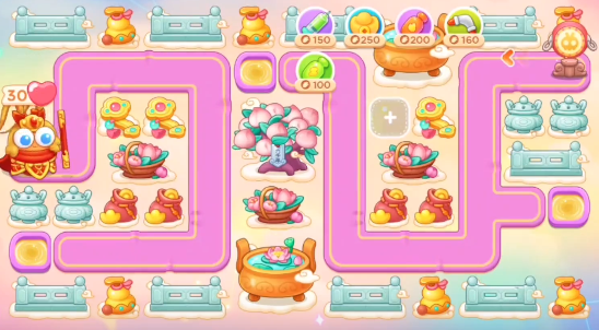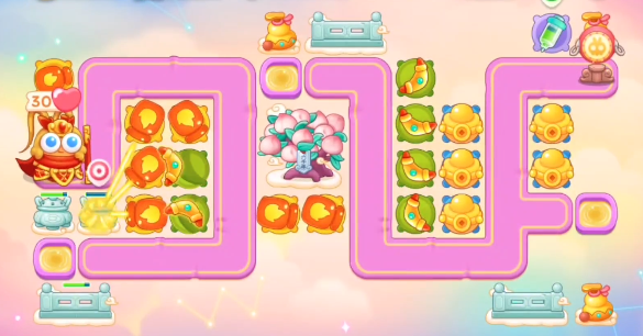 1、本关能够使用的炮塔是:毒针、元宝、火瓶、回旋镖、普通炮,这一关我们比较好用的输出是回旋镖。