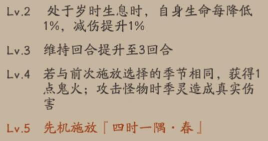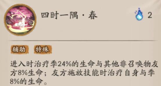 【施放】牺牲最大生命的24%(不足时保留1点),展开维持2回合的「四时一隅」并获得1层四季流转,同时根据所处季节施加额外效果。在「四时一隅」中自身无法被「四时一隅春」之外的效果治疗或恢复生命,友方施放技能后将为敌方目标附加季灵。若与前次施放选择季节不同,自身获得岁时生息,持续2回合。