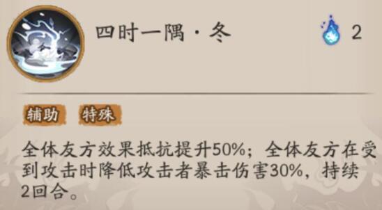 全体友方效果抵抗提升50%;全体友方在受到攻击时降低攻击者暴击伤害30%,持续2回合。