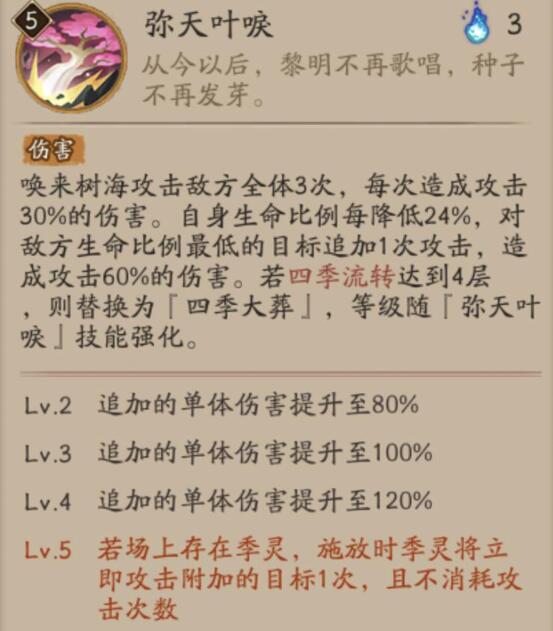 唤来树海攻击敌方全体3次,每次造成攻击30%的伤害。自身生命比例每降低24%,对敌方生命比例最低的目标追加1次攻击,造成攻击60%的伤害。若四季流转达到4层,则替换为「四季大葬」,等级随「弥天叶唳」技能强化。