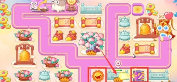 3.卷轴被打掉后,空出的位置补放一个烟花塔,锁定钱袋,有钱后,将场上烟花塔升级;