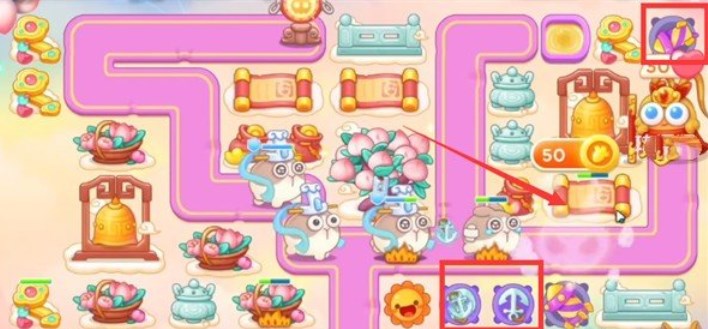 2.打掉场上的粉兔子后,锁定上方的卷轴,在萝卜处放置烟花塔,围栏的位置放置两个一级船锚;
