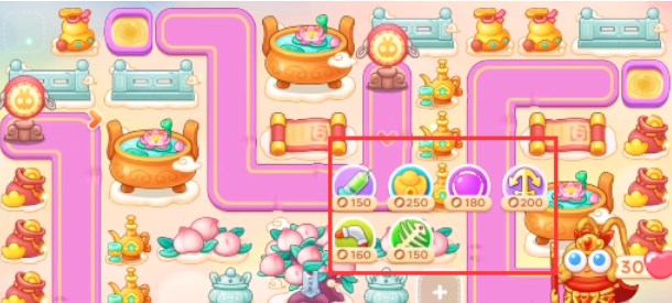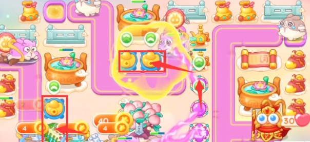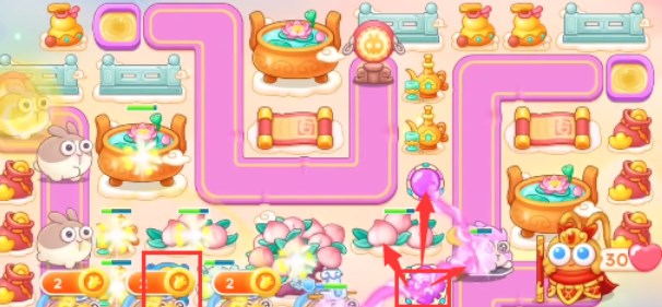 1、本关能够使用的炮塔是:毒针、元宝、魔法球、船锚、回旋镖、鱼刺,这一关我们要高输出就要使用魔法球。