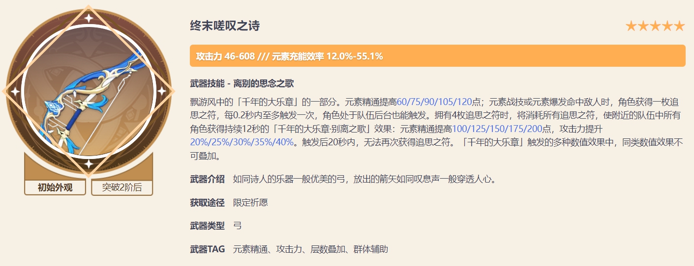 其他的五星武器,基本都是输出用的,也就终末嗟叹之诗能给辅助用用了,副词条是充能,还可以加伤。