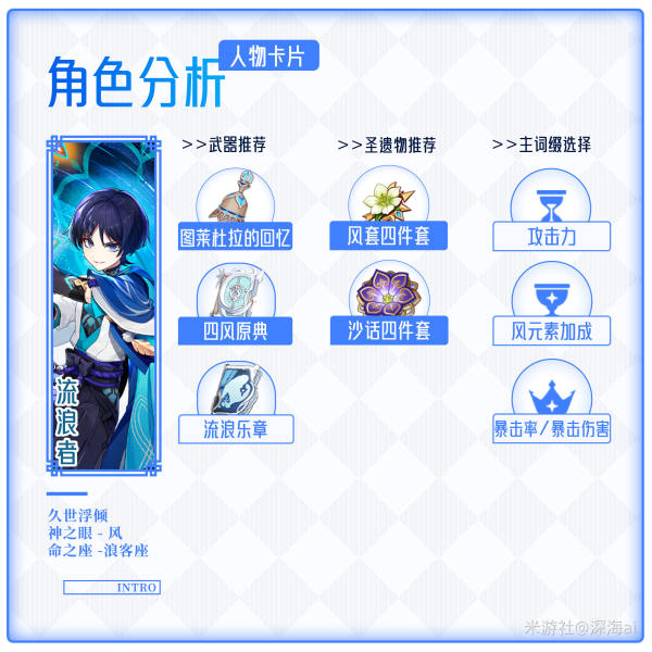 武器方面,专武风铃高白值+暴伤,特效攻速搭配高额增伤十分契合流浪者。驻场的话四风、天空也都可以用,携带冰系盾辅的话,盾锁也是个不错的选择。神乐提供的战技加成无法对战技后的普攻生效,吃满效果还需要启动时间,不推荐。四星武器流浪乐章赌到攻击/风伤也很强势,但是不适合站场。月卡武器匣里日月特效有时间限制,需要每轮在特效快消失时用大招续buff,对充能有一定需求。