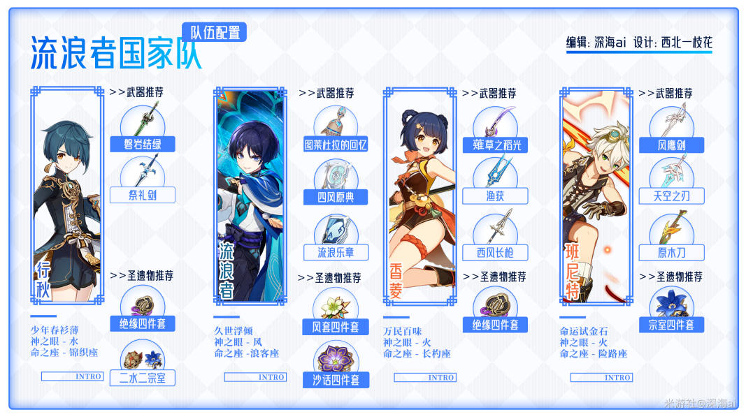 角色的配队也是分析是否值得抽的因素之一。对于流浪者来说,就业队伍十分丰富,一种是利用风套扩散减抗的优势,代替砂糖进入武装/国家队,通过自身不俗的伤害拉高队伍的上限。一种是特化自身伤害,搭配珐露珊的增幅,挑起队伍输出大梁,携带火/冰辅助或脱手输出组成单核/双核队伍。
