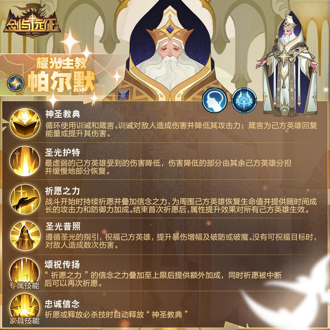 剑与远征即将上线全新的英雄-耀光主教帕尔默,相信不少玩家都对这个新英雄十分好奇,想要了解这个新英雄到底怎么样?技能效果又是什么呢?下面就让小编为你详细介绍一下,感兴趣的朋友们赶紧来看一看吧!
