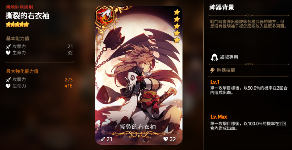 双子会让梅宣变成多动症儿童,运气好的情况下出血buff层数会叠的很夸张。当然,双子也有自己本身的劣势,远不如右衣袖来的稳定、满破等级要求较高、攻击buff的回合容易用完。
