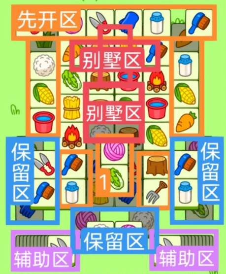 2.开局先消除橙色区的牌,这里压牌。尽量要让牌面保持在同一水平面,然后一层一层消除表面牌,不要跨层太多拿牌,等表面牌消除完后,以大别墅内互相消除为主。